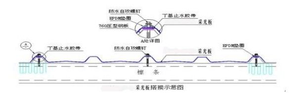 3. 采光板與鋼板在縱向搭接時(shí),最小必須有200mm的重疊,并貼置兩條止水帶。
