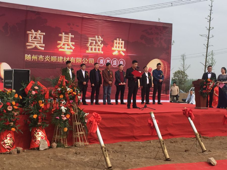 4月14日上午,隨州市炎順建材有限公司項目奠基儀式于隨縣新經(jīng)濟(jì)開發(fā)區(qū)新項目建設(shè)基地隆重舉行,炎順瓦業(yè)公司董事長劉永德,總經(jīng)理劉炎、衡陽炎順瓦業(yè)公司總經(jīng)理劉永才、總監(jiān)陳月棟,泉州炎順瓦業(yè)公司總經(jīng)理劉歡、總監(jiān)劉東方以及公司運營部、財務(wù)部、研發(fā)部、廠區(qū)、質(zhì)保部等相關(guān)負(fù)責(zé)人攜全體員工共同參加了本次儀式,同時蒞臨奠基儀式的嘉賓有隨縣政府的副縣長,江蘇波美特瓦業(yè)有限公司宋總攜夫人等考察團(tuán)一行。 據(jù)相關(guān)資料顯示,炎順集團(tuán)隨州基地概況:占地面積:40畝、投資金額:1億5000萬、工廠面積:1萬平方米、辦公樓面積:2800平方、住宅樓面積:2800平方、就業(yè)人員:200人、年產(chǎn)值:1.2億元人民幣。